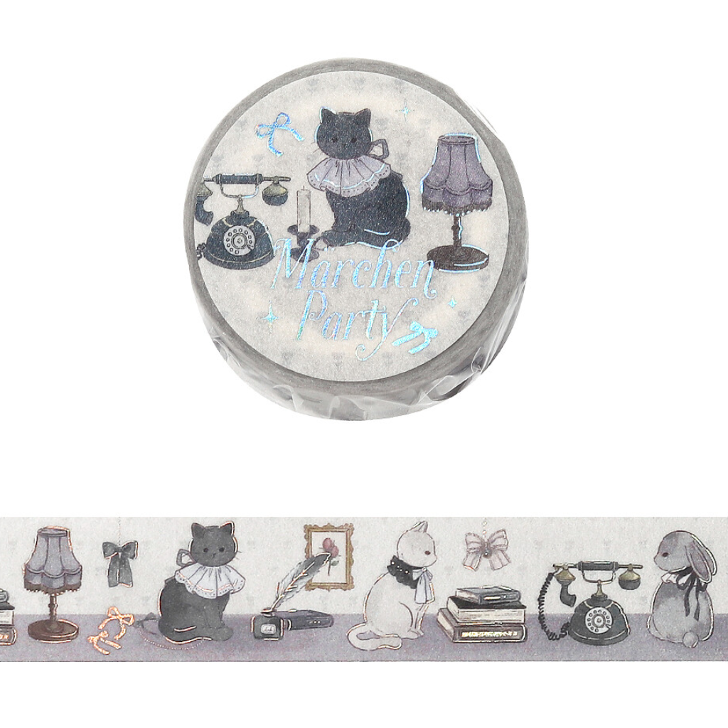 The BGM fairy tale grey cat washi tape features an enchanting lineup of vintage inspired illustrations, including elegant grey cats dressed in ruffled collars alongside antique telephones, books, lamps, and quill pens. Soft, muted tones of silver and charcoal create a dreamy storybook feel, while subtle foil accents add a delicate shimmer as the light hits the tape. Perfect for journaling, scrapbooking, and letter writing, this whimsical design brings a cozy, old world charm to every page.