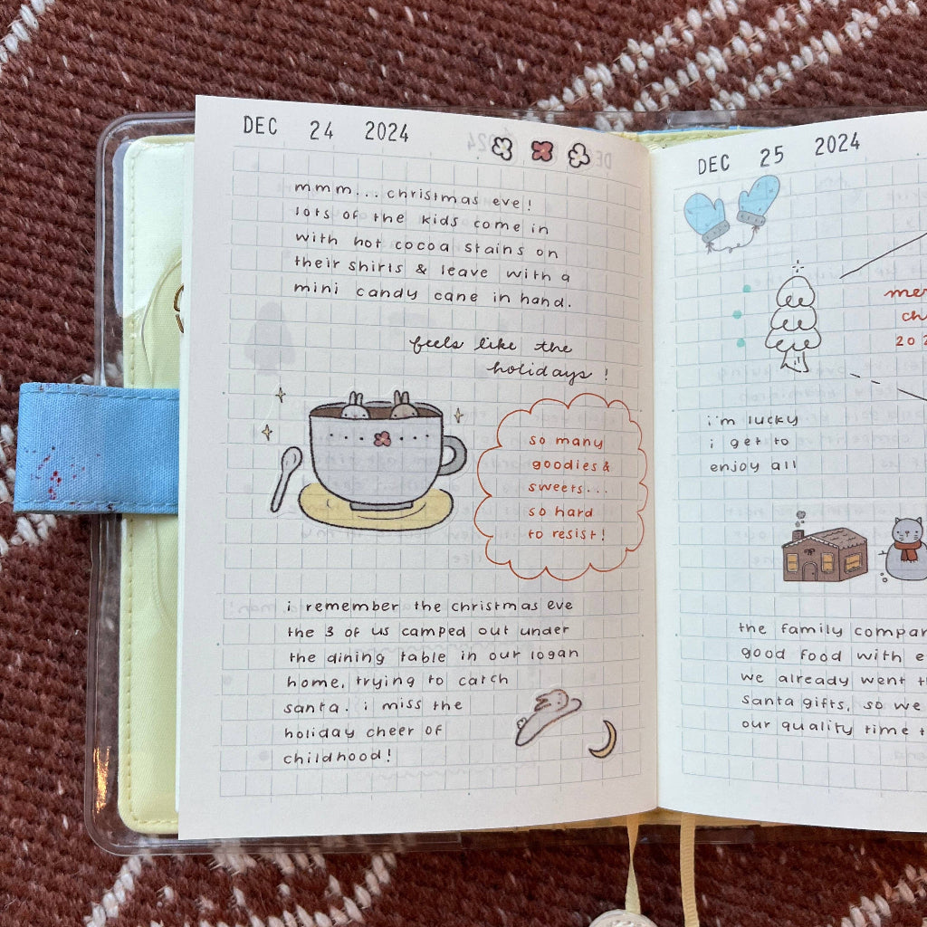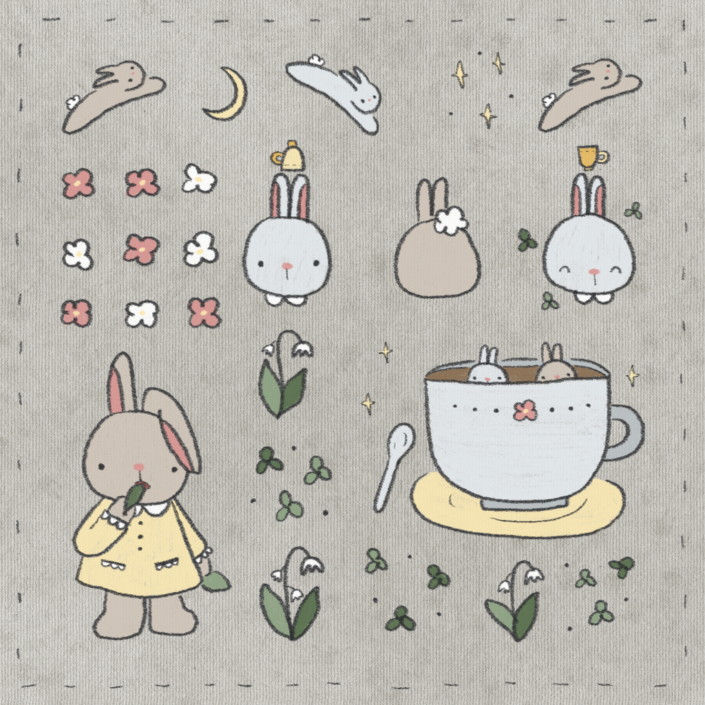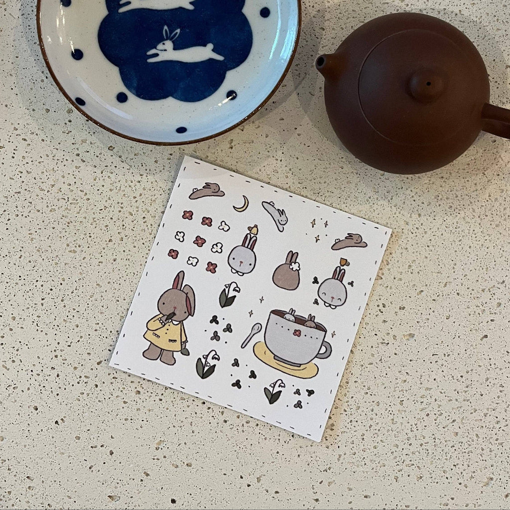 This cozy washi sticker set features sweet little bunnies sipping tea, snacking on greens, and floating through a dreamy garden scene. Perfect for planners, journals, and snail mail, these soft, whimsical stickers add a warm cup-of-tea kind of happiness to every page. Designed in California by dana ate oatmeal!