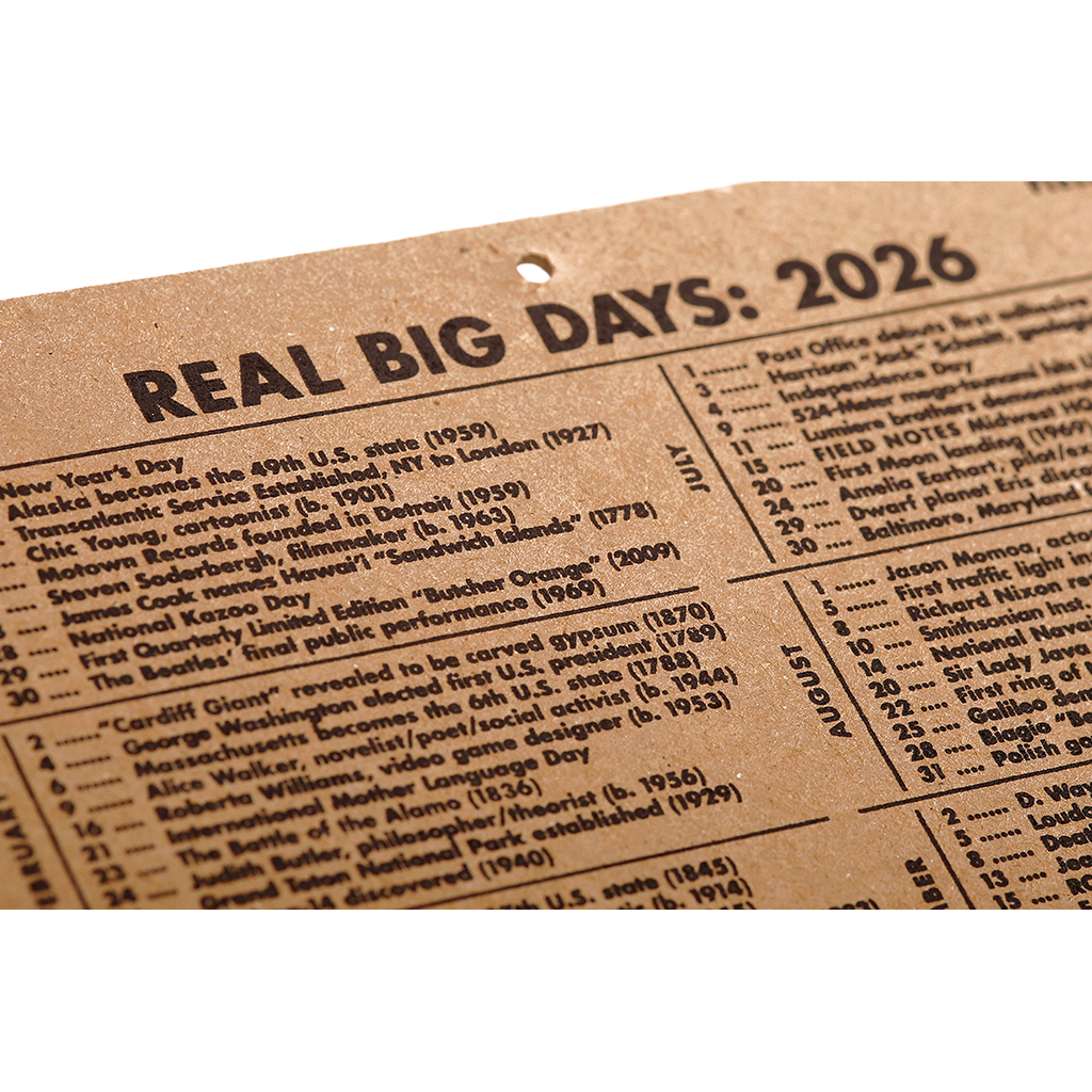 The front includes tear-off pages from November 2025 all the way through January 2027. On the back you’ll find a huge, sort-of-comprehensive, list of “Real Big Days” throughout the year.