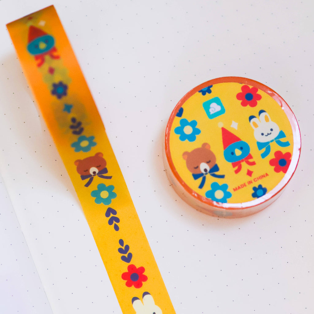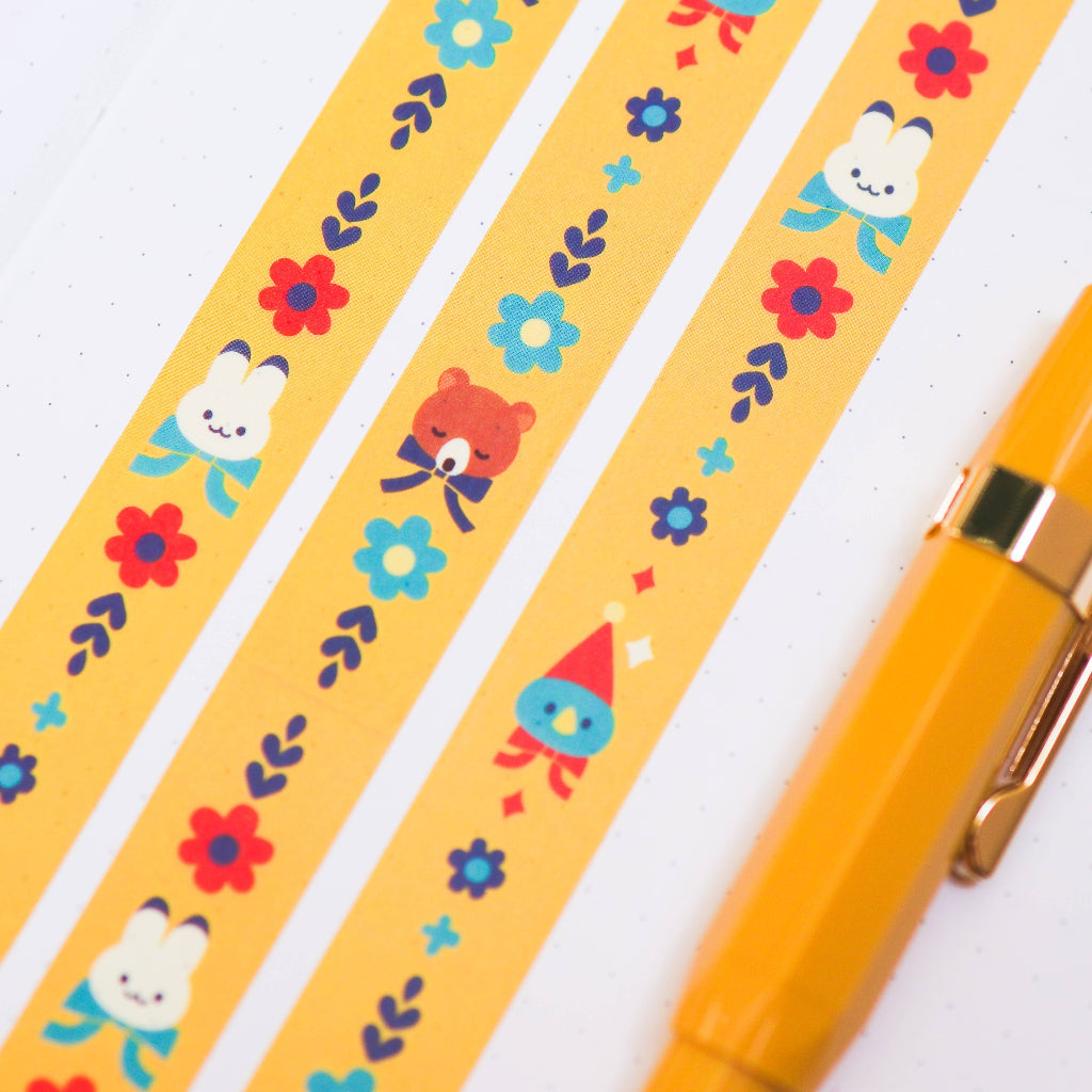 This Thousand Skies washi tape features an adorable parade of a bear, bunny, and little blue bird surrounded by bright flowers and playful shapes. It’s perfect for adding a cheerful pop of color and cuteness to journals, planners, and happy mail.