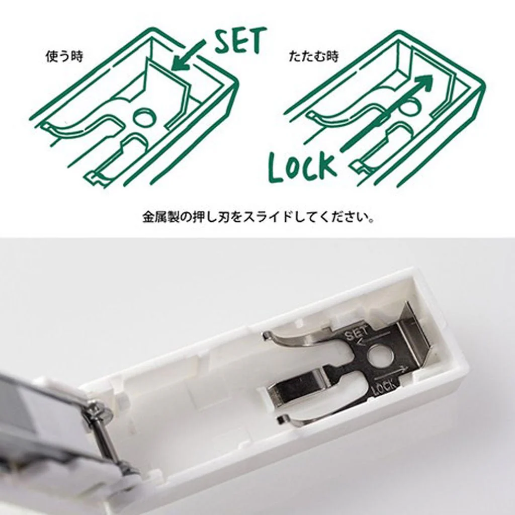 To Use: Open the top, slide the metal piece down toward "SET," and close. To collapse, open the top, slide the piece up toward "LOCK," then press the stapler shut until it clicks.
