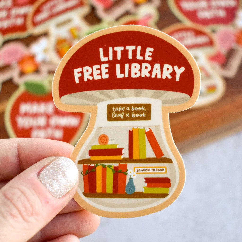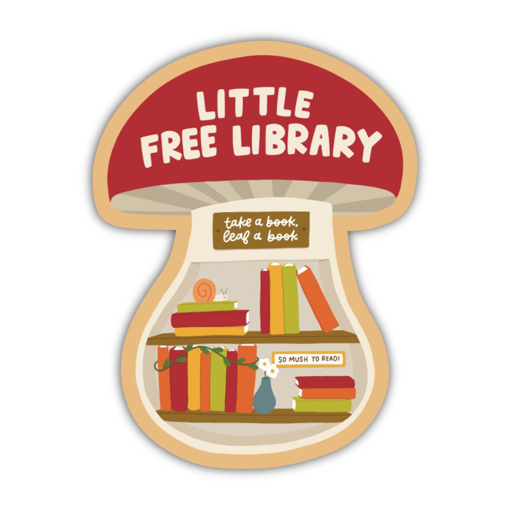 So mush to read! This whimsical sticker turns a giant mushroom into a Little Free Library, complete with shelves of books in the stalk. A perfect design for bookworms, forest lovers, and anyone who believes there’s always room for one more story.