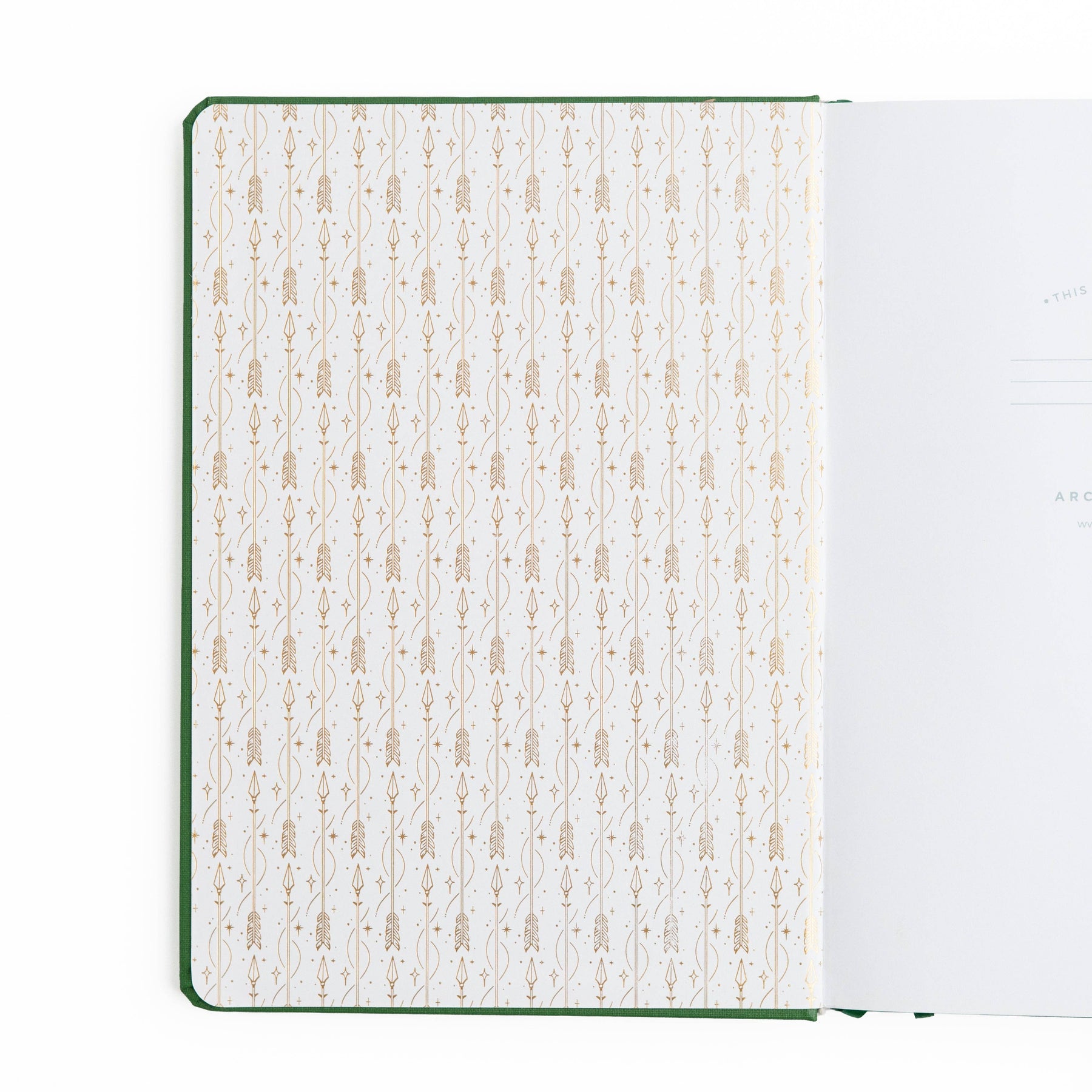 Simple, timeless, and powerful. The Archer Notebook features a deep green buckram cover with a delicate gold-foil style bow and arrow design. Finished with a coordinating spine and patterned end pages, it’s a perfect everyday notebook for writing, planning, and creative work.