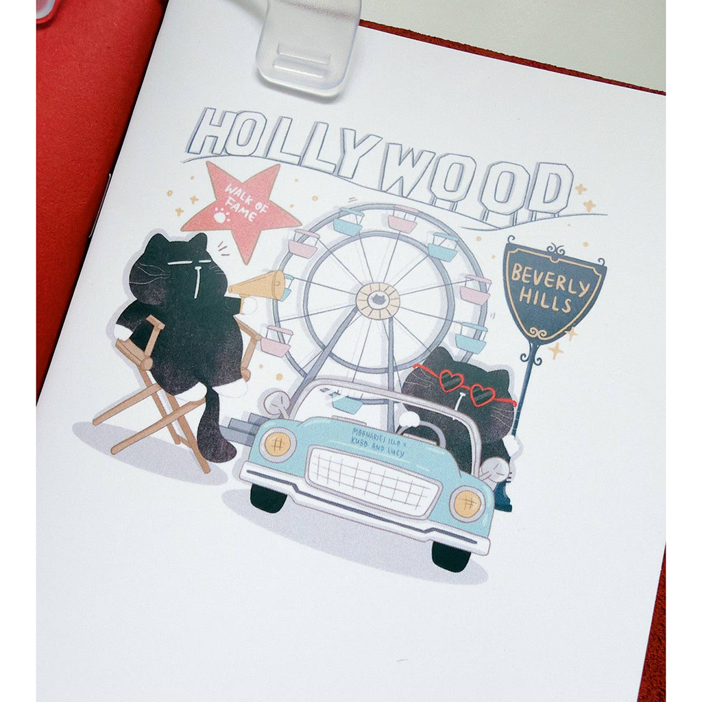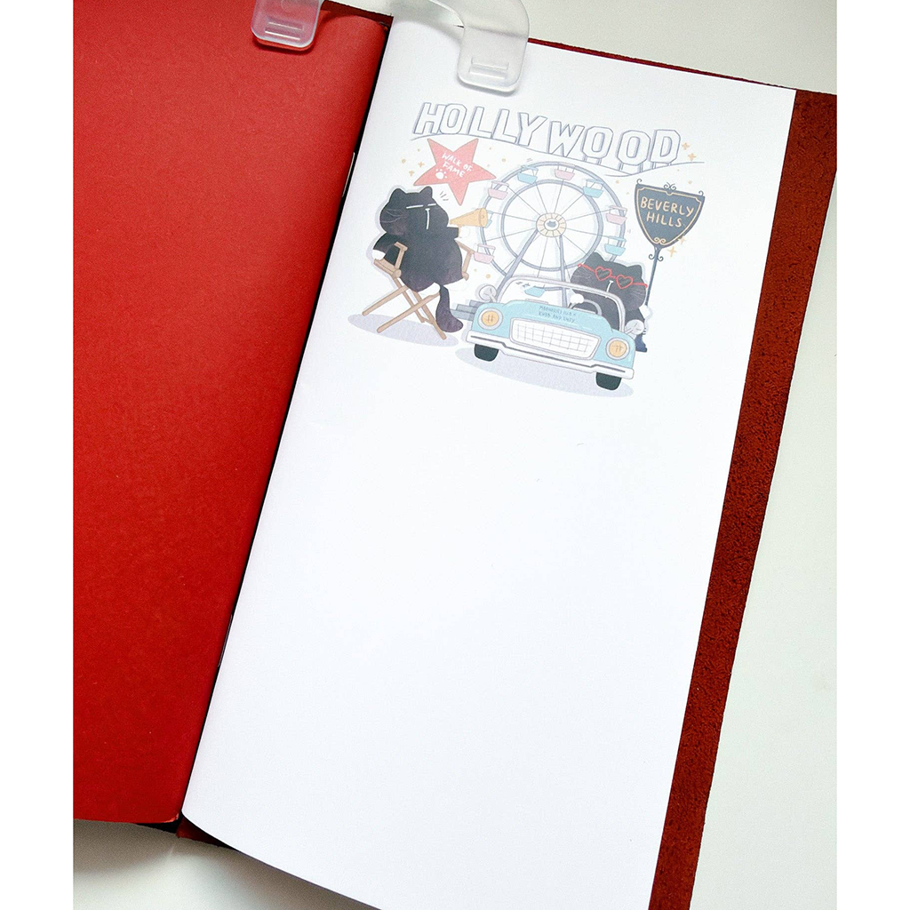 This Kuboandlucy notebook features smooth sticker release paper, making it perfect for collecting, rearranging, and reusing your favorite stickers or washi without losing their stick. The playful artwork by artist Moonaries Illo adds a fun, whimsical touch, with charming characters and a dreamy Hollywood-inspired scene that feels straight out of a storybook. Whether you're organizing your sticker stash or creating a creative layout for you Traveler's Notebook, this notebook turns every page into a little moment of joy.