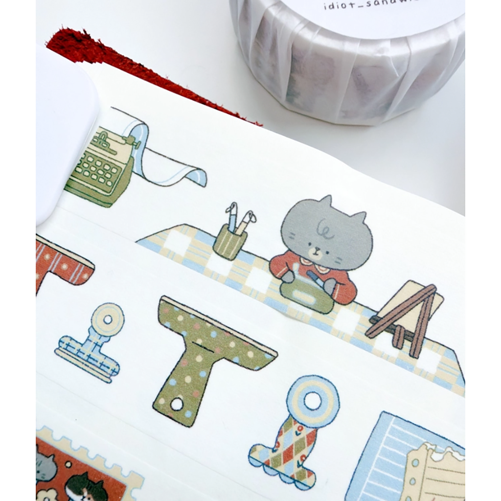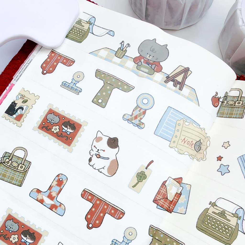 This charming stationery-themed washi tape features cozy illustrations of cats surrounded by everyday desk essentials like typewriters, clips, notes, stamps, and tiny bags. Soft pastel colors and playful details create a warm, journaling-inspired scene that feels like a quiet afternoon at a creative workspace. Perfect for planners, scrapbooks, and happy mail, this decorative tape adds a delightful stationery lover’s touch to any page.