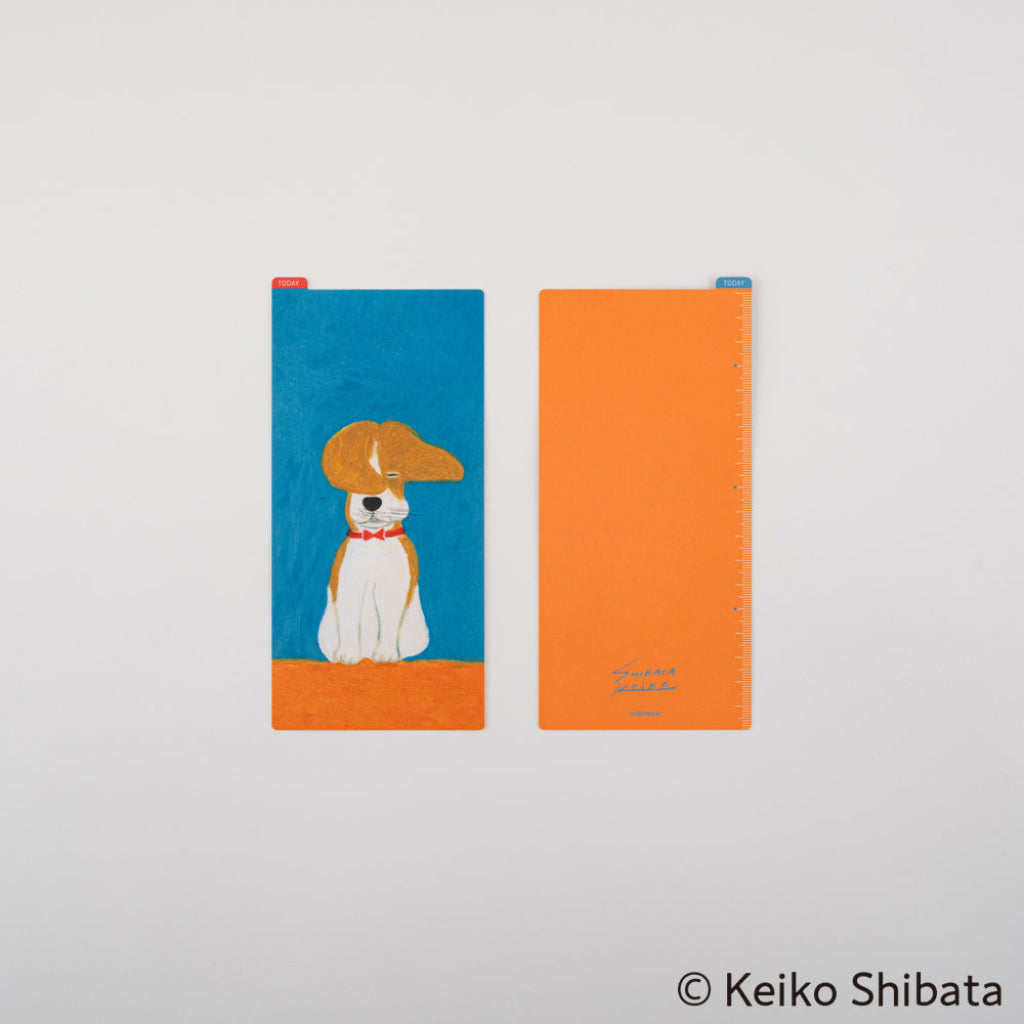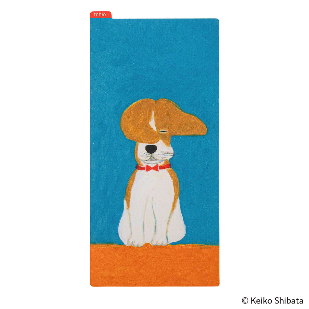 Este tablero para lápices tiene el mismo tamaño que su techo correspondiente. Tiene una pestaña "Hoy" en la esquina para que puedas usarlo como marcapáginas. Esta colaboración con Keiko Shibata incluye una obra de arte suya basada en el tema "viento". El viento alborota las orejas y el pelaje facial de un perro beagle que está sentado obedientemente en la posición "Quieto".