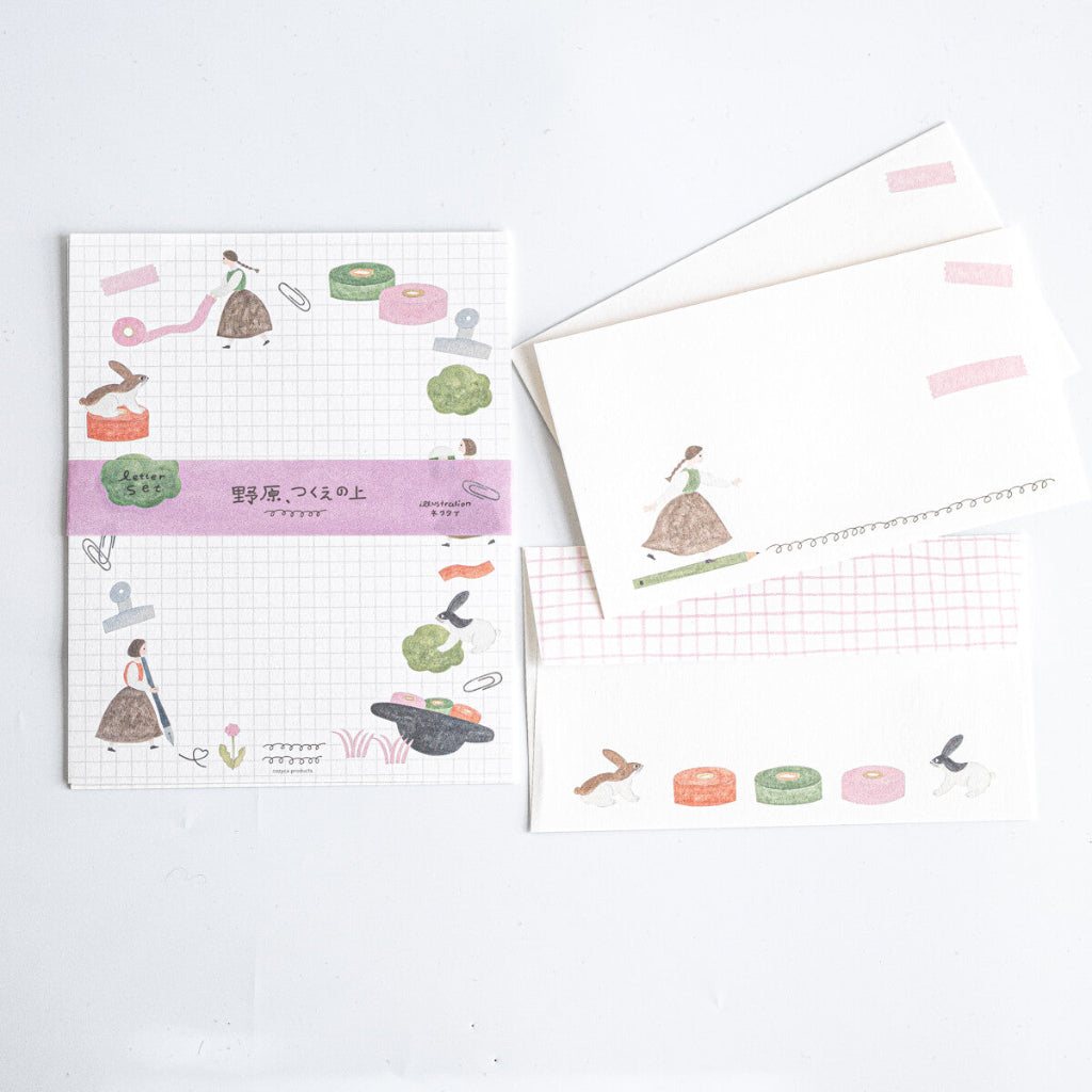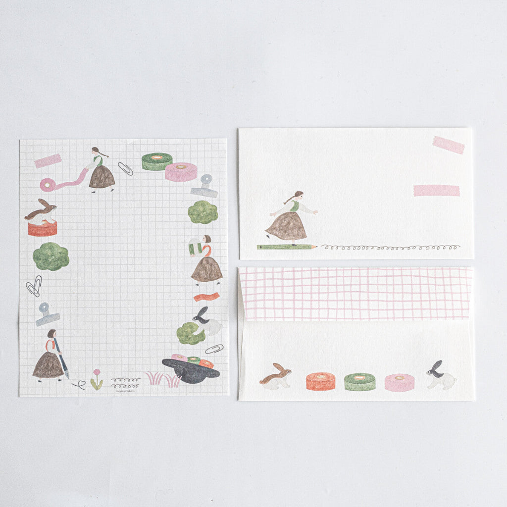 This Cozyca letter set features gentle stationery-themed illustrations by Aiko Fukawa, filled with charming scenes of washi tape, paper clips, notebooks, and playful rabbits. Soft pastel colors and delicate hand-drawn details create a calm, whimsical design that feels like a quiet moment at a creative desk. Perfect for heartfelt letters, pen pal correspondence, or thoughtful notes, this set adds a sweet handmade touch to every message you send.