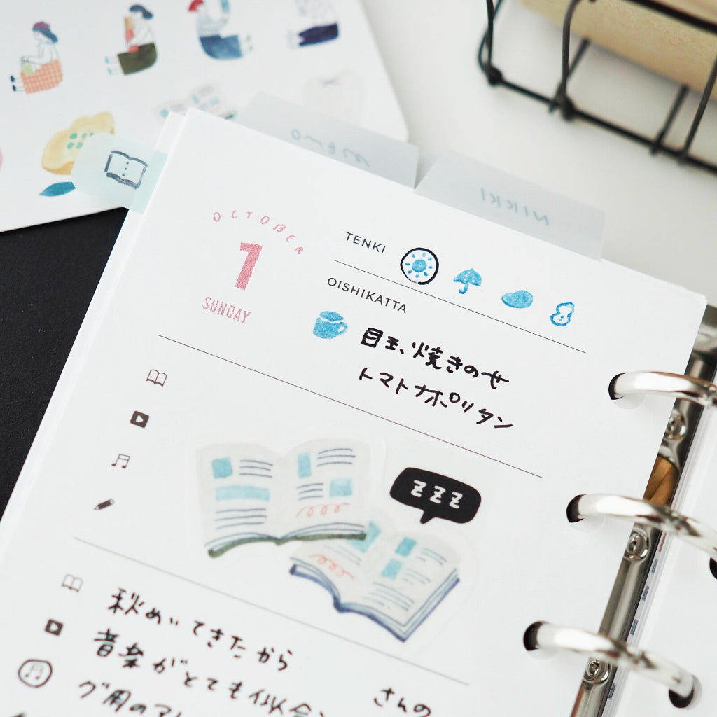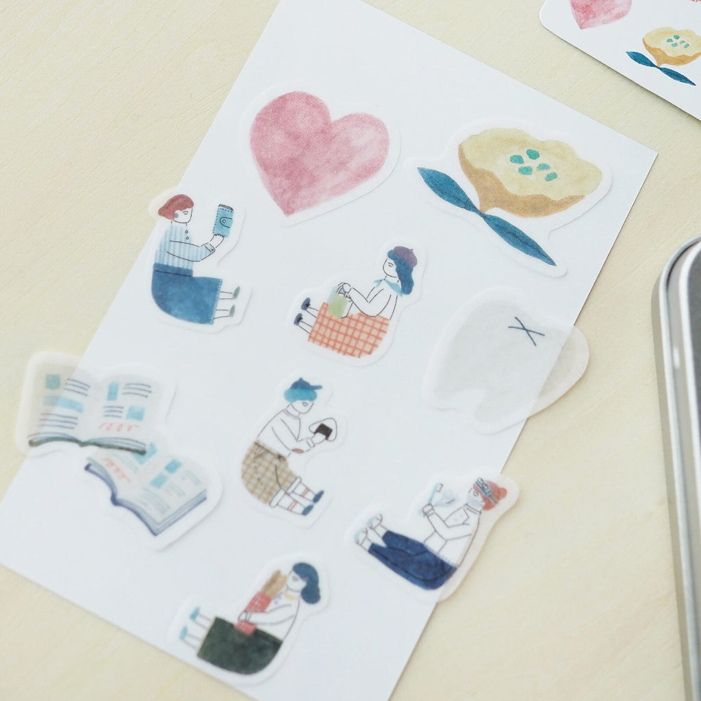 The Papier Platz flake sticker set features soft watercolor style illustrations of everyday moments, from reading books and scrolling on a phone to sweet symbols like hearts and flowers. Each die cut sticker has a gentle, muted color palette and a slightly translucent finish that layers beautifully in journals and planners. Thoughtful and quietly charming, these stickers add a cozy storytelling touch to scrapbook pages, letters, and daily spreads.