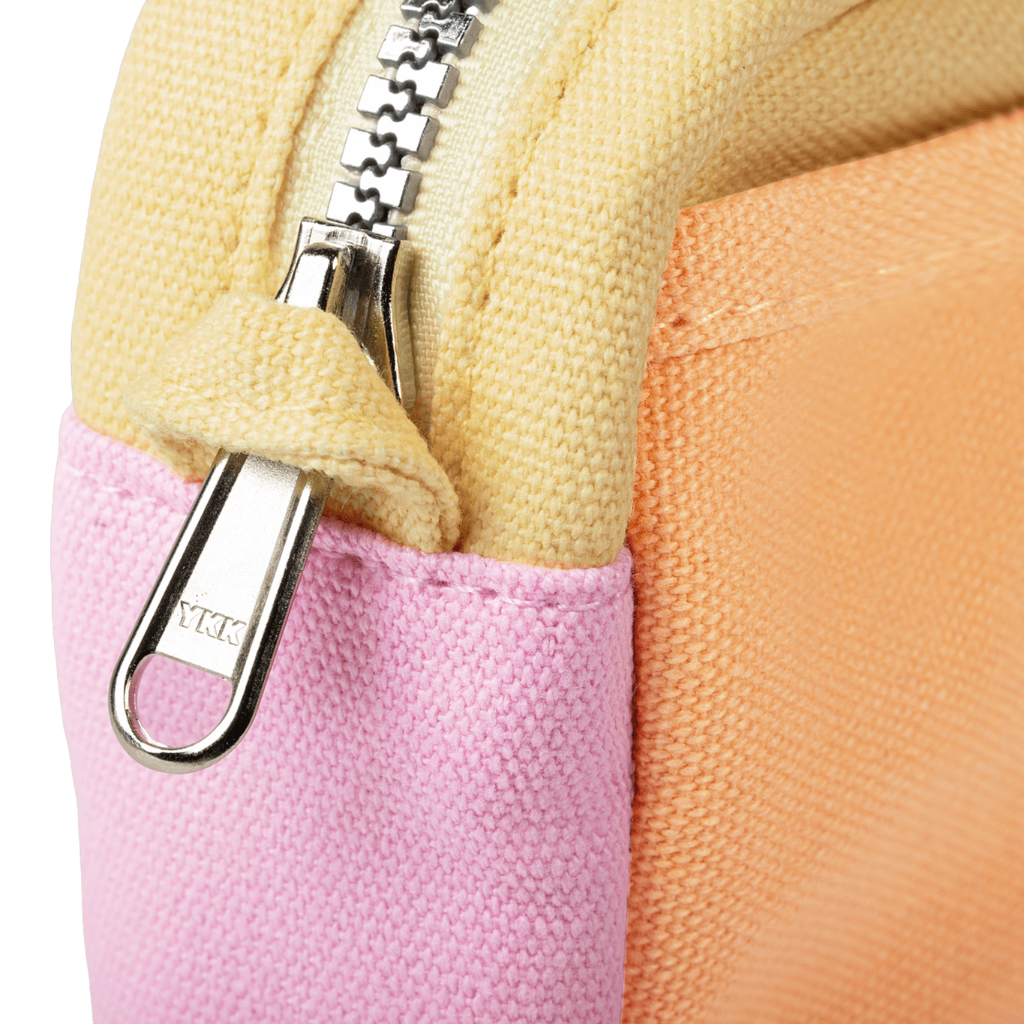 Close-up of a multicolored bag with a zipper, featuring a brand logo.