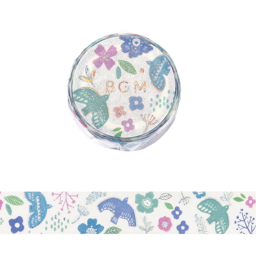 This BGM washi tape features charming songbirds fluttering among delicate blossoms and leafy sprigs, accented with subtle shimmering foil for a soft, magical touch. Perfect for brightening planners, journals, and happy mail, this BGM washi tape brings a cheerful birds-in-bloom vibe to every page.