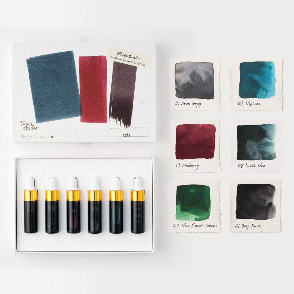 The Tom's Studio Essentials Mini Ink Collection features their everyday icons. Timeless shades that never go out of style – whether you’re jotting notes, signing cards, or writing something a little more heartfelt. 6 x 5ml bottles of their water-based, vegan-friendly fountain pen ink with curated colour stories to help explore ink with confidence. Packages are hand-painted in the studio so no two are the same.